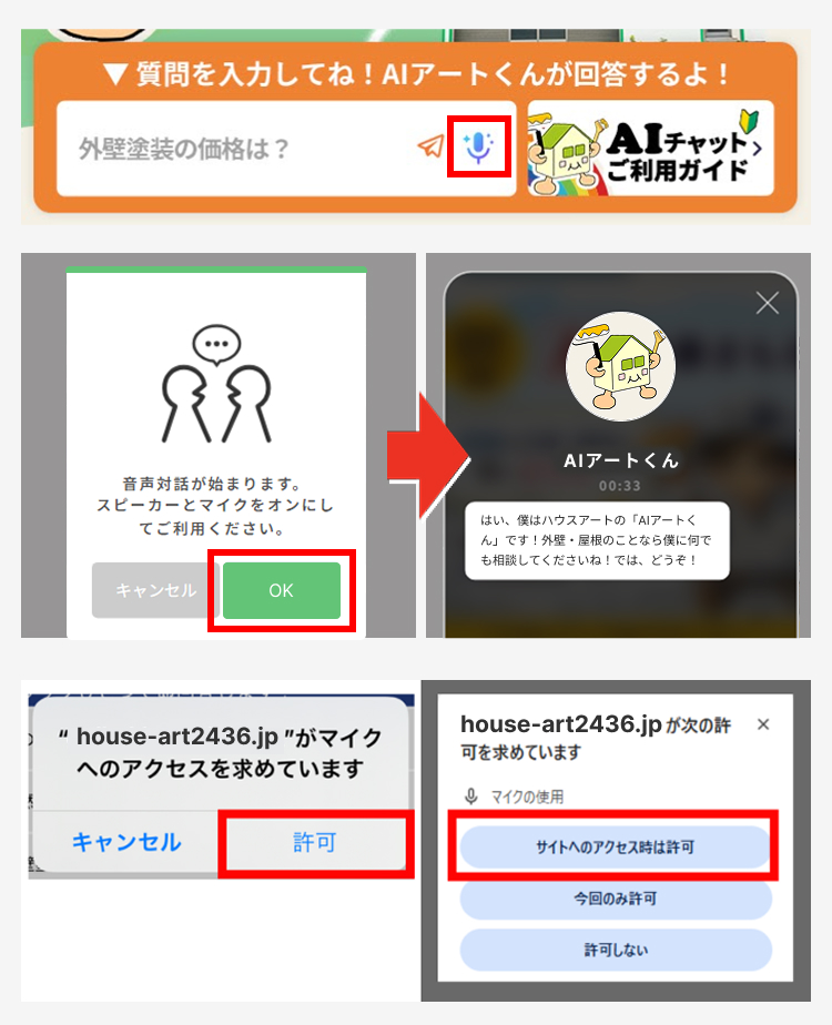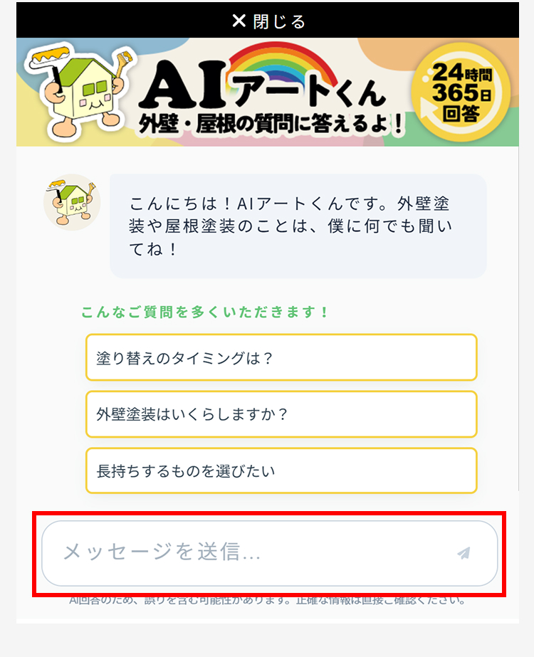 音声対話でも、外壁塗装や屋根塗装などの質問や相談ができます!AIアートくんと、気軽に電話のような感覚で対話をしてお悩み解決ができます。
