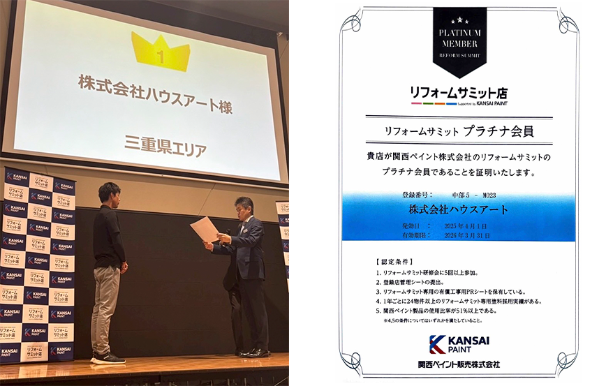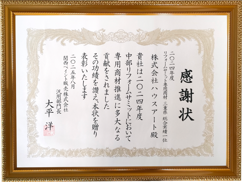 このたび株式会社ハウスアートは、関西ペイントが認定する加盟店限定塗料「RS塗料」において、三重県内 施工実績1位として表彰をいただきました。