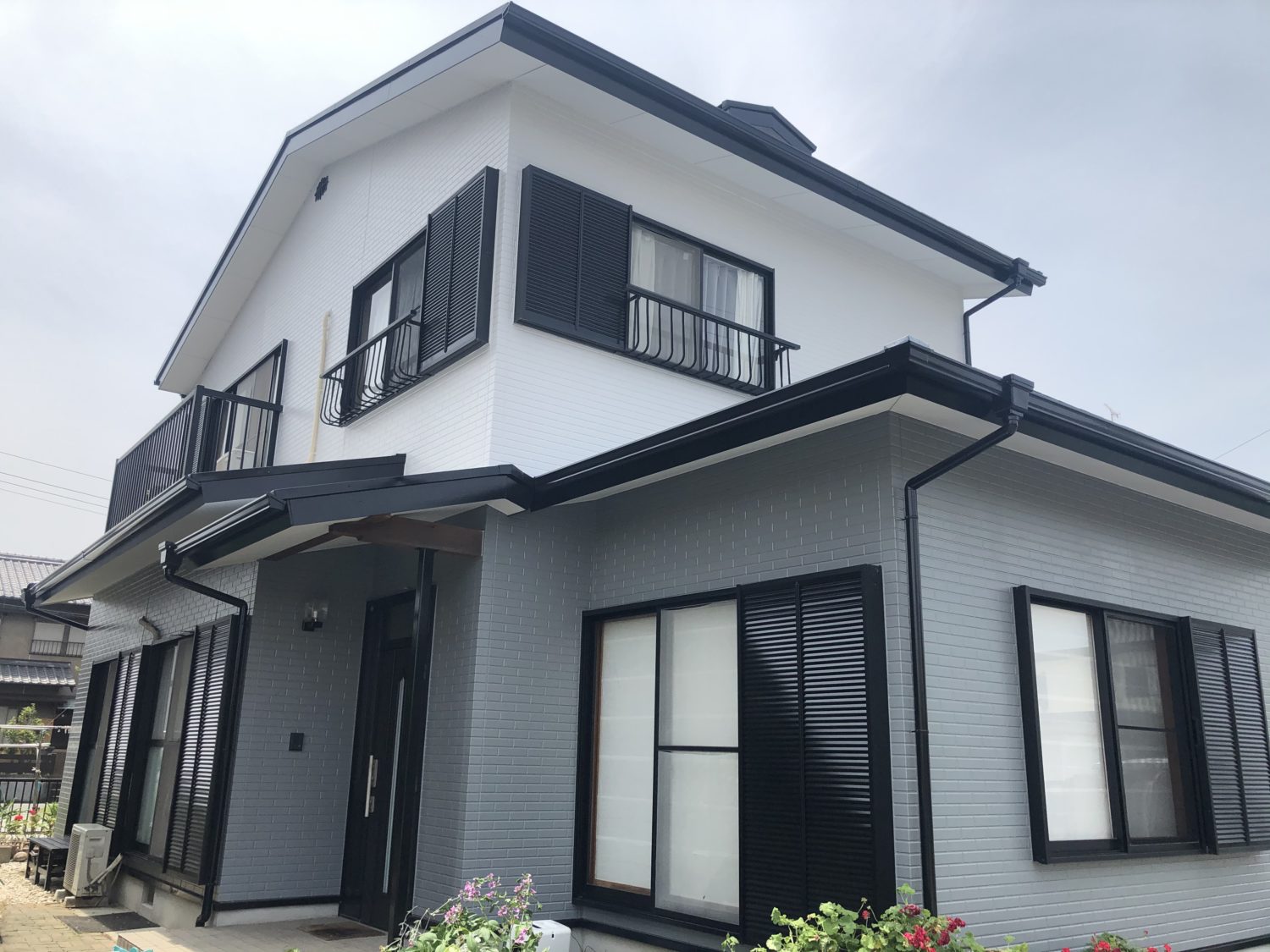 施工前はシーリングの劣化、サイディングの反り返り、チョーキングがあり、塗り替えが必要な状態でした!着工までに2か月ほど待っていただきありがとうございました!!外壁の色は元々グレー単体の予定でしたが、冊子や付帯部が全てブラックでしたので家全体が暗くならないよう上下で色分けするツートンをご提案させていただきました!奥様、ご主人からもお喜びのお声をいただき嬉しかったです!