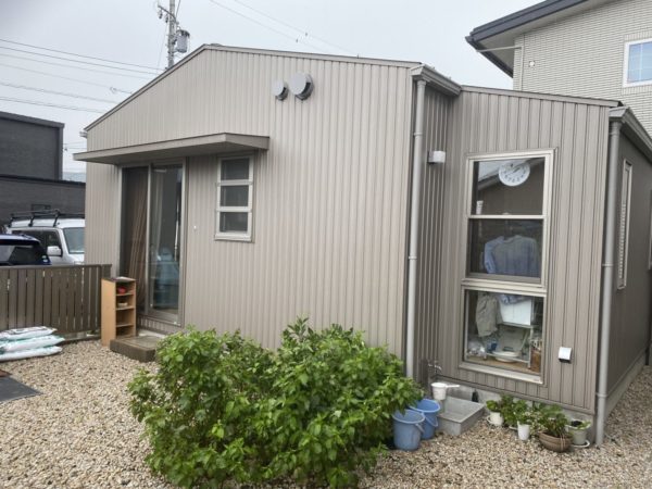 外壁がガルバでしたのでローラーでの塗装も検討しましたが表面がフラットですのでローラーでの塗装だと繋ぎ目のムラが光の加減で出てしまうと判断し、吹き付け塗装を行なっています。