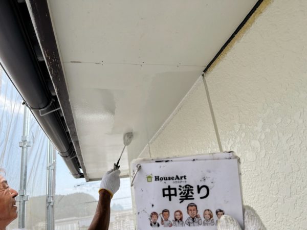 軒天は地面からの湿気のダメージを受けやすく結露しやすくカビが発生する部位ですので通気性のある防藻防カビ効果のある塗料での塗装となります。