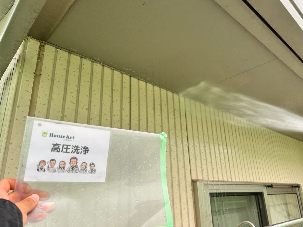 外壁の汚れや、古い塗料を取り除くために高圧洗浄を行います。