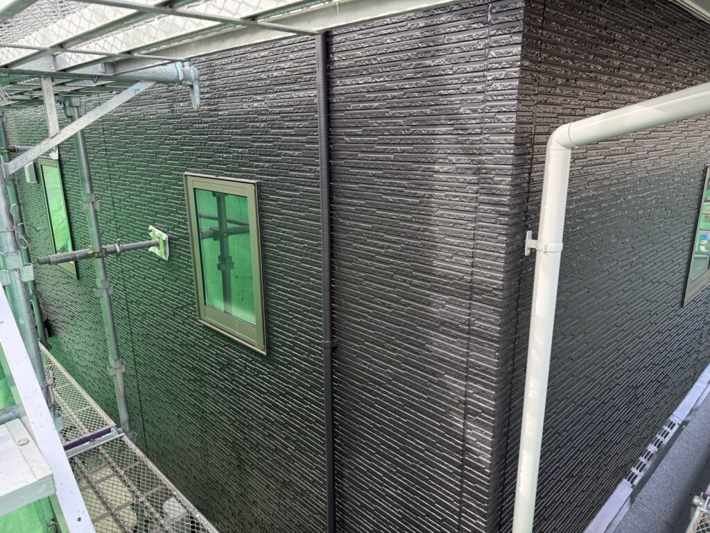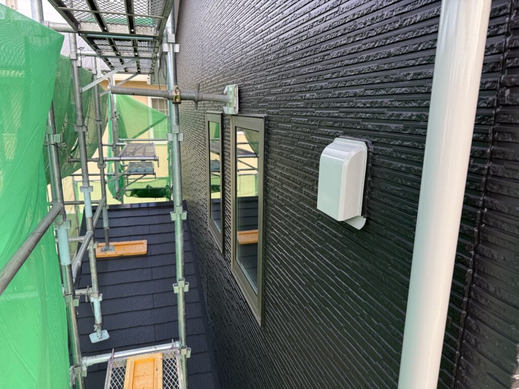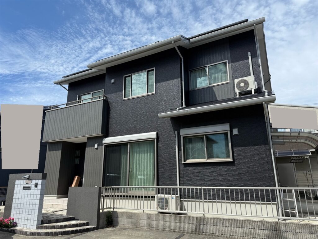 施工前の外壁はメイン色がホワイトで今回大幅にイメージを変えたいとのお声をいただき打合せさせていただきメイン色をブラック。アクセント部分をダークグレーで塗装させていただきスマートでかっこよく仕上がりました。