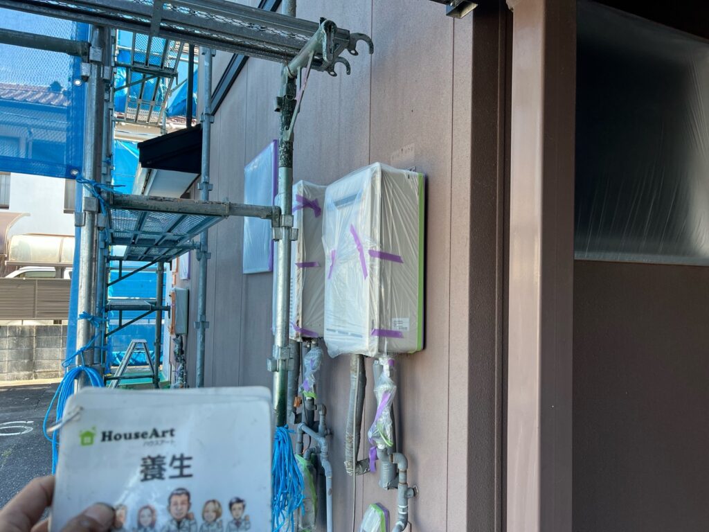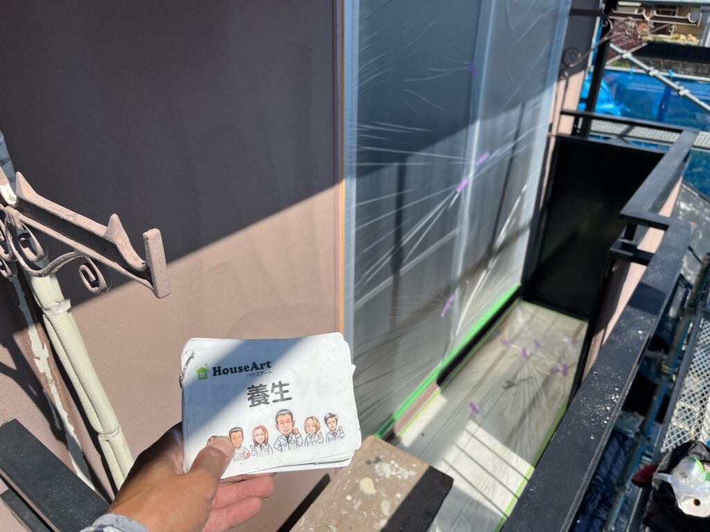 高圧洗浄後、工事中に発生する粉塵や塗料などを、塗装する箇所以外に飛散させないように養生を行います。